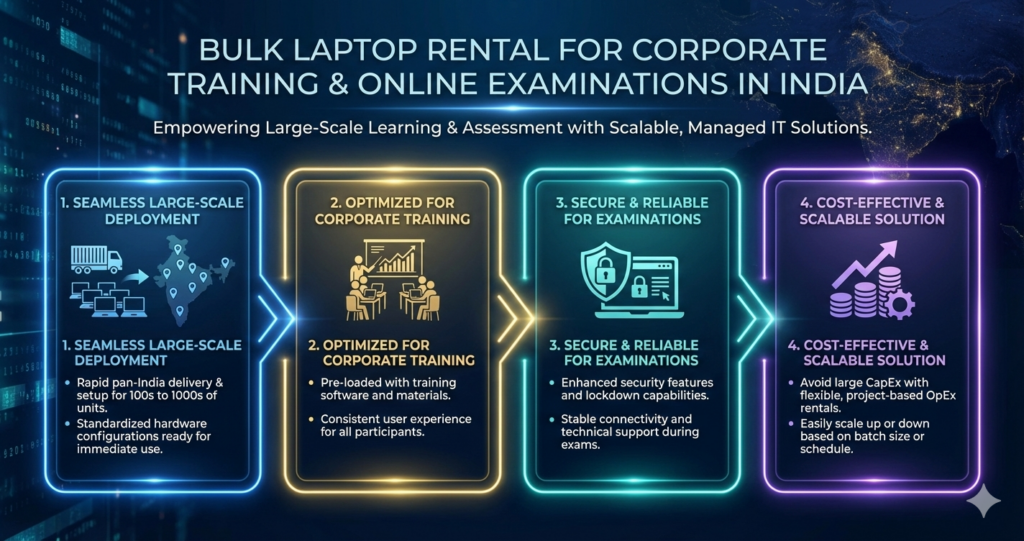 As corporate training and online examinations continue to expand across India, the need for reliable and flexible technology infrastructure has never been greater. Bulk laptop rental addresses this need by offering cost-effective access to standardized, secure, and scalable devices.